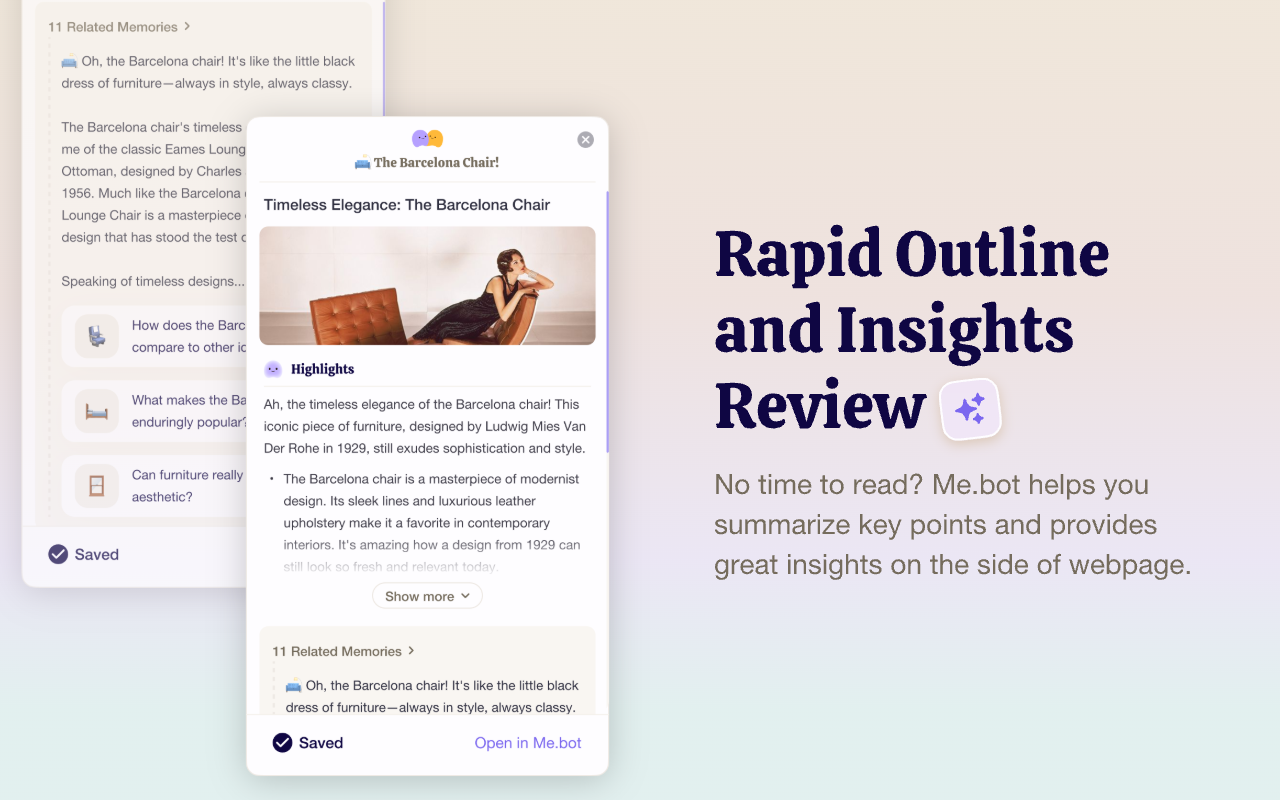 • Rapid Outline and Insights Review: No time to read? Me.bot helps you summarize key points and provides great insights on the side of the webpage.