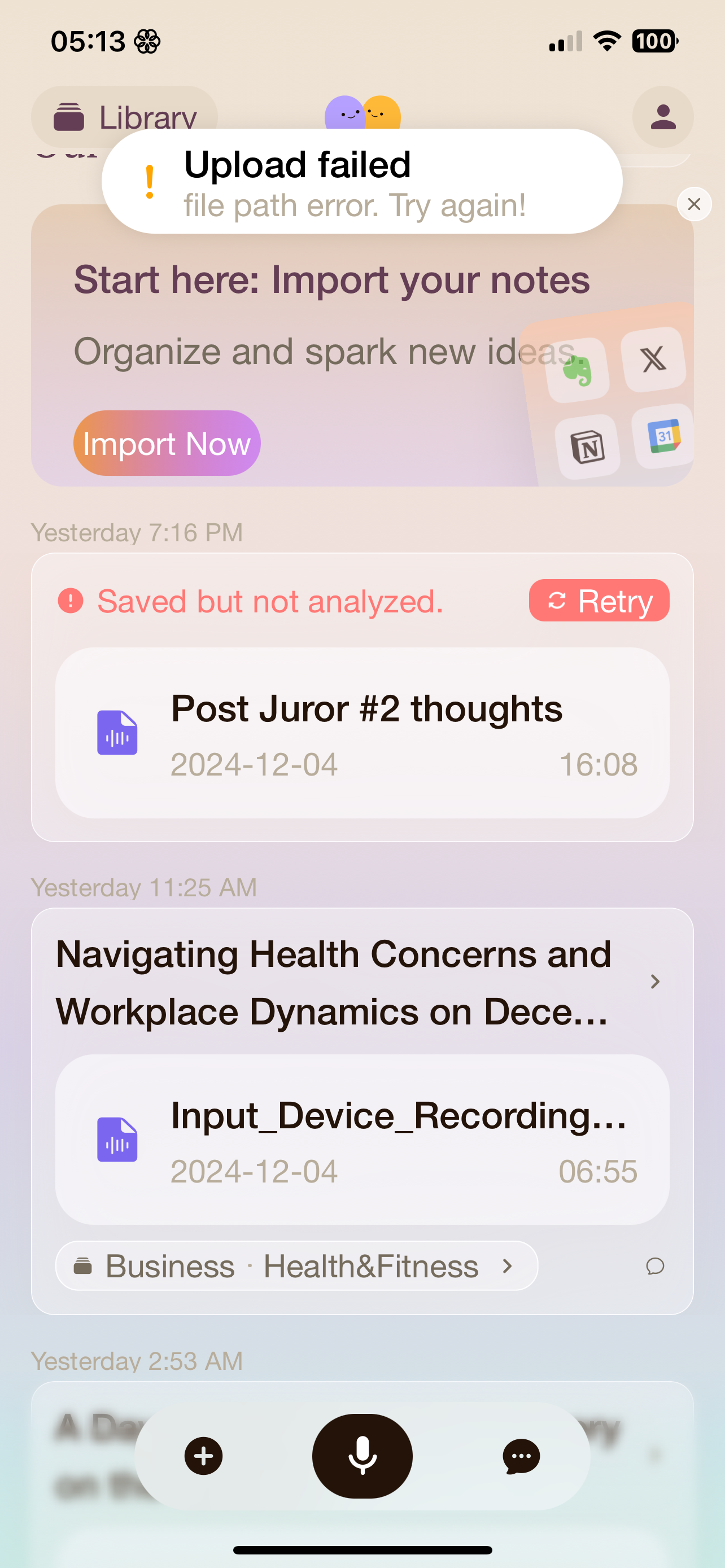Yesterday, after dictating into a recording, recording was saved but I get a: